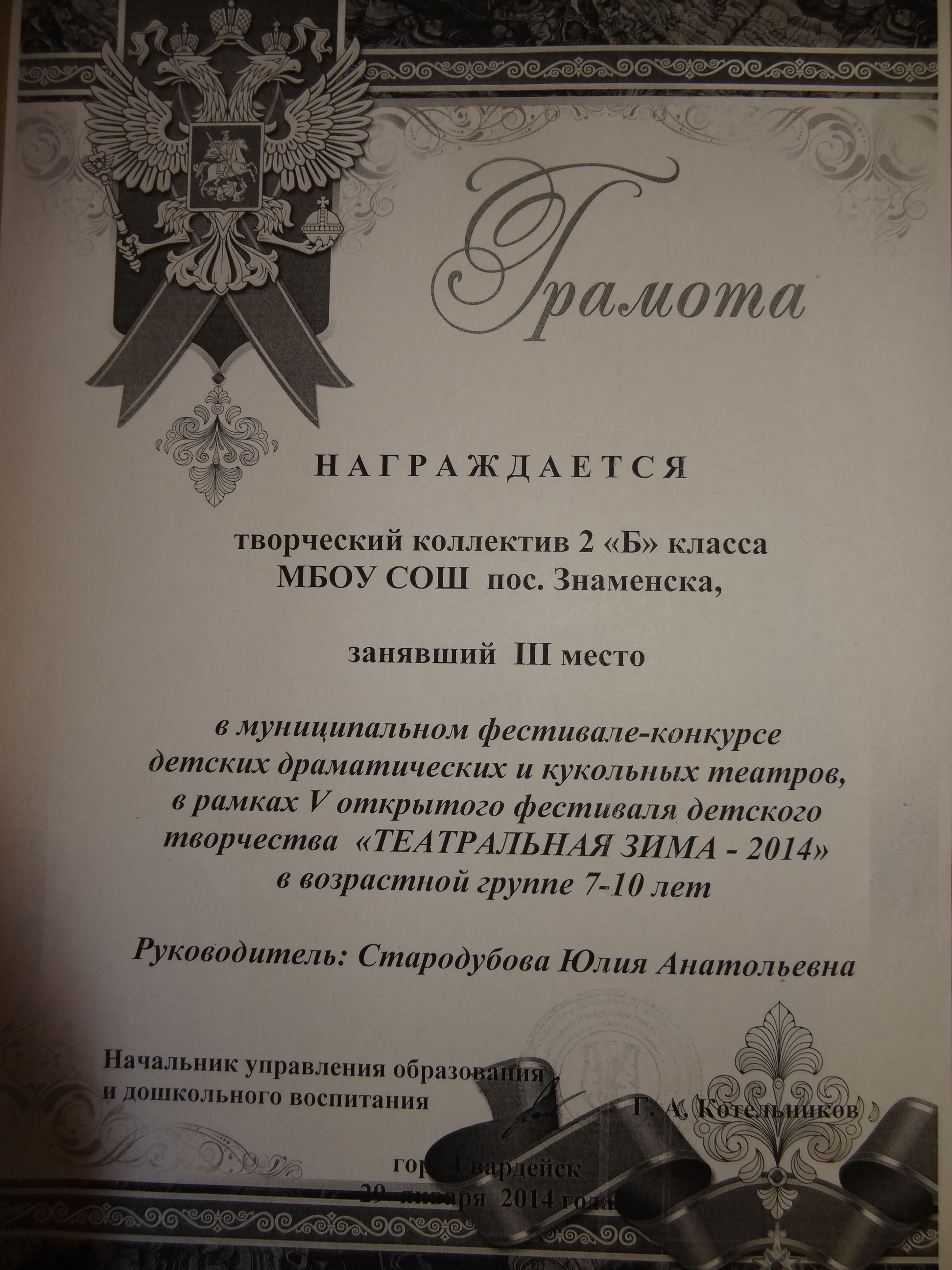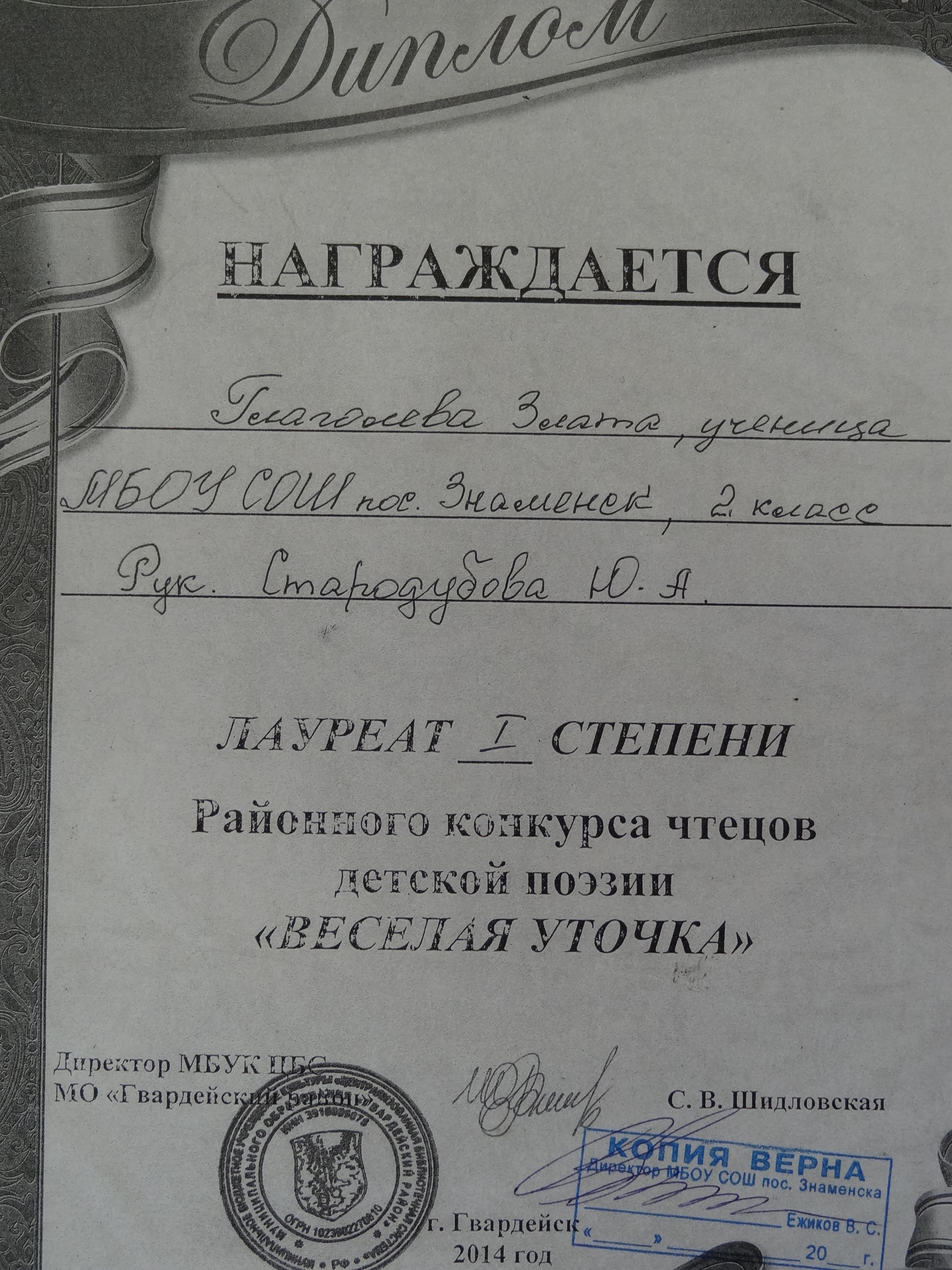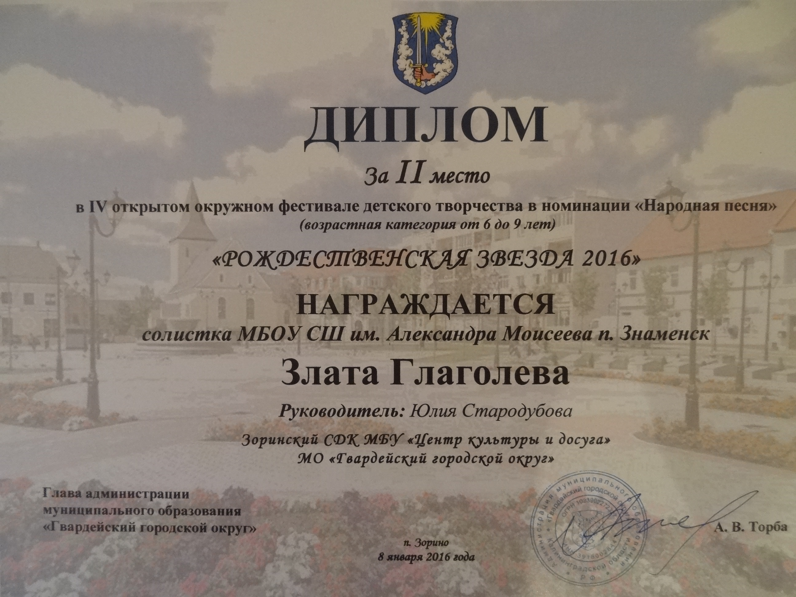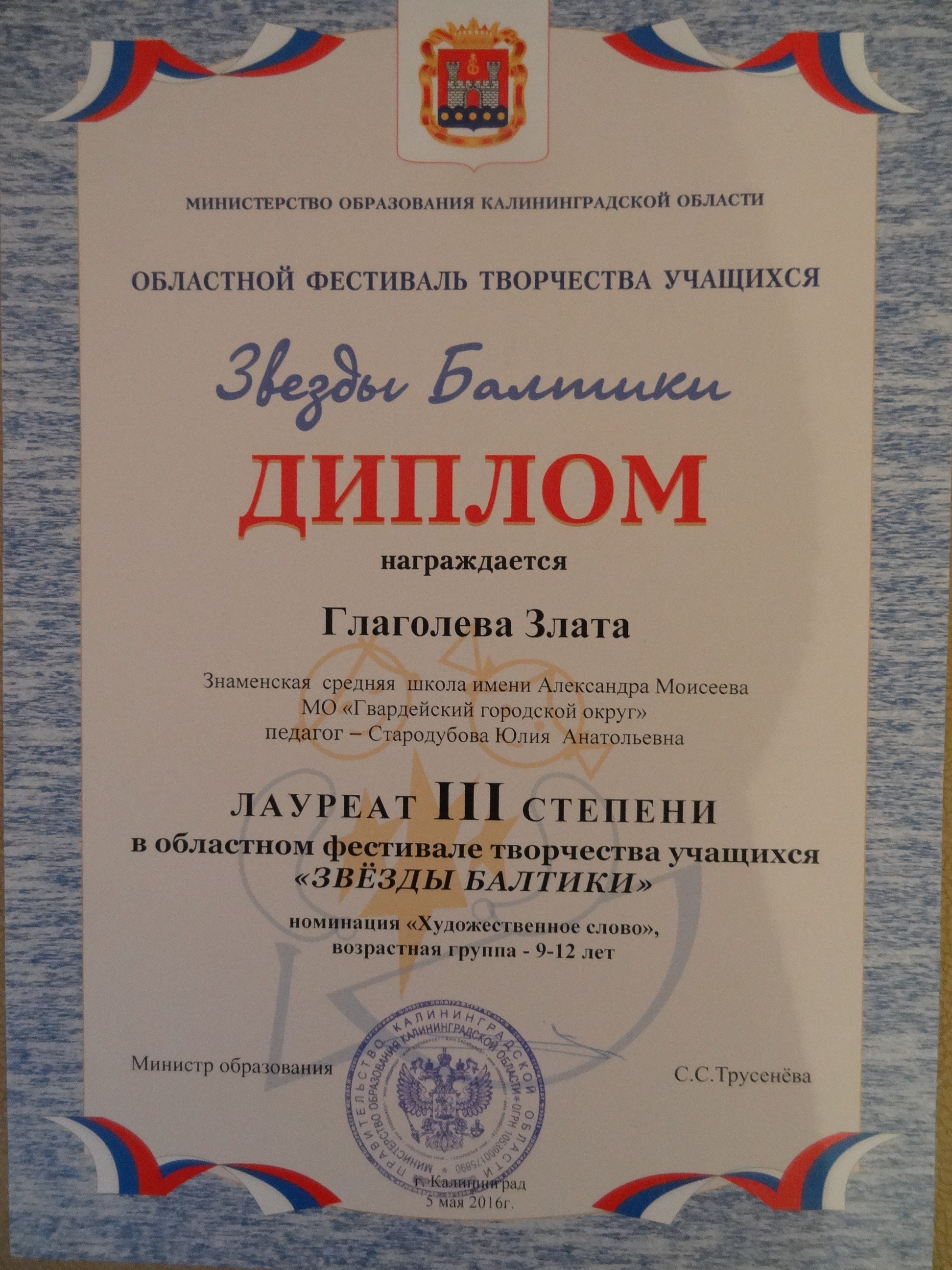 Диплом. Областной фестиваль творчества учащихся "ЗВЁЗДЫ БАЛТИКИ" - лауреат III степени.