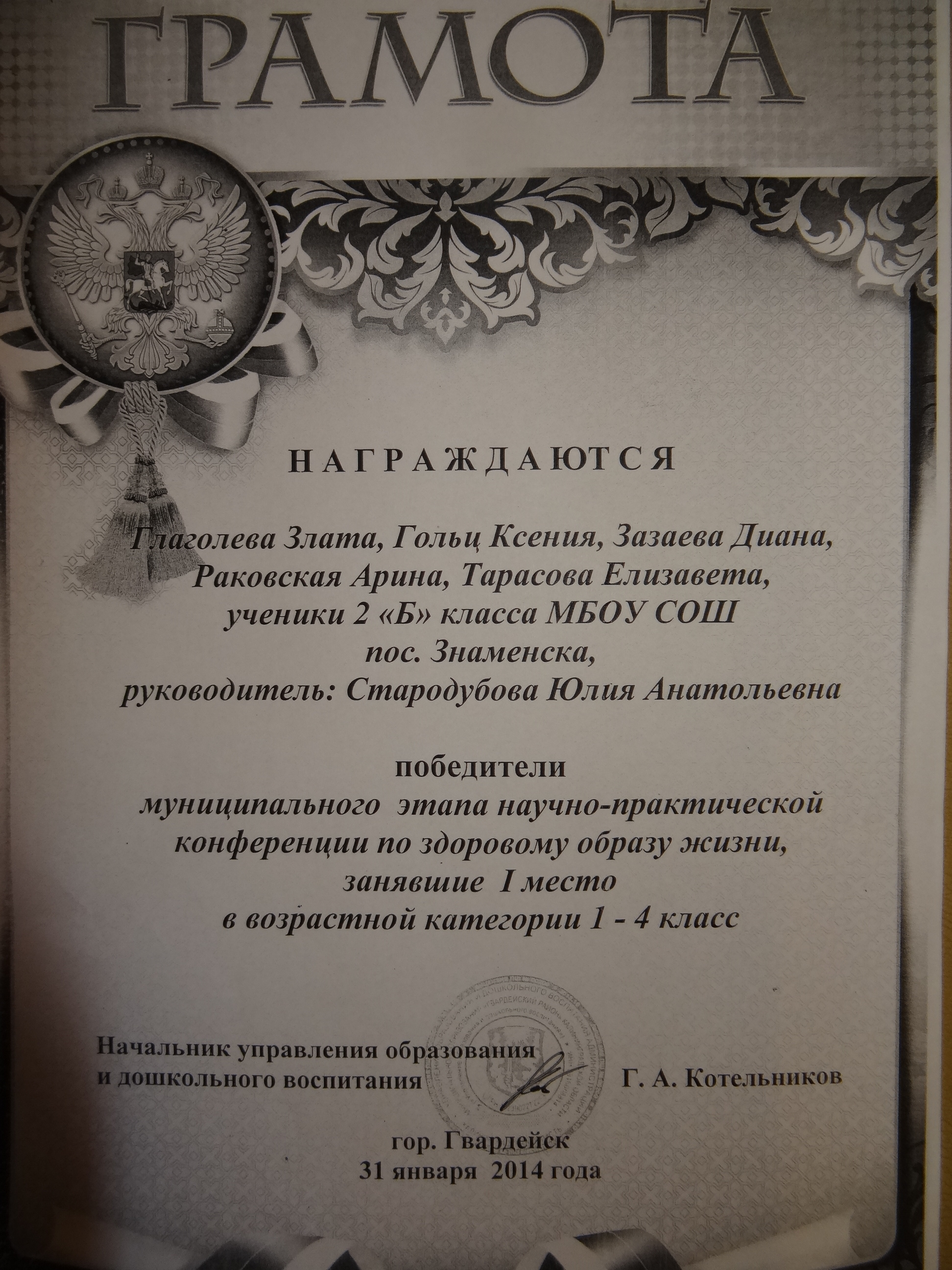 Грамота. Исследовательская конференция по ЗОЖ "Школа - территория здоровья" - 2 место.